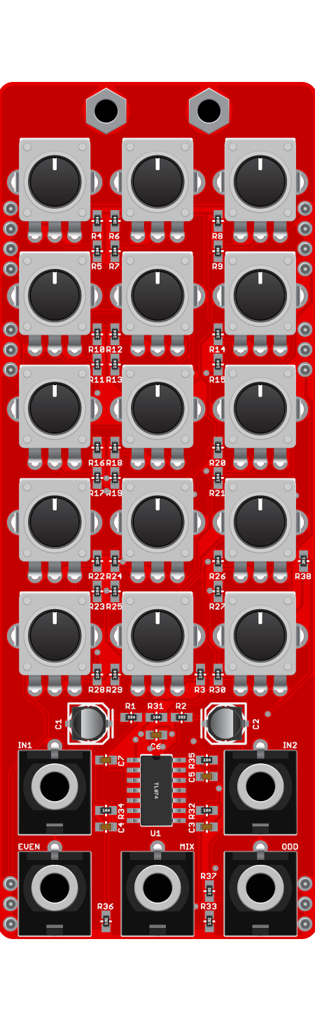 BANK consists of 12 band-pass, one high-pass and one low-pass filter to cover the full audio range. The circuit is based on the Yusynth FFB, but it's packed much smaller than other versions of this module.